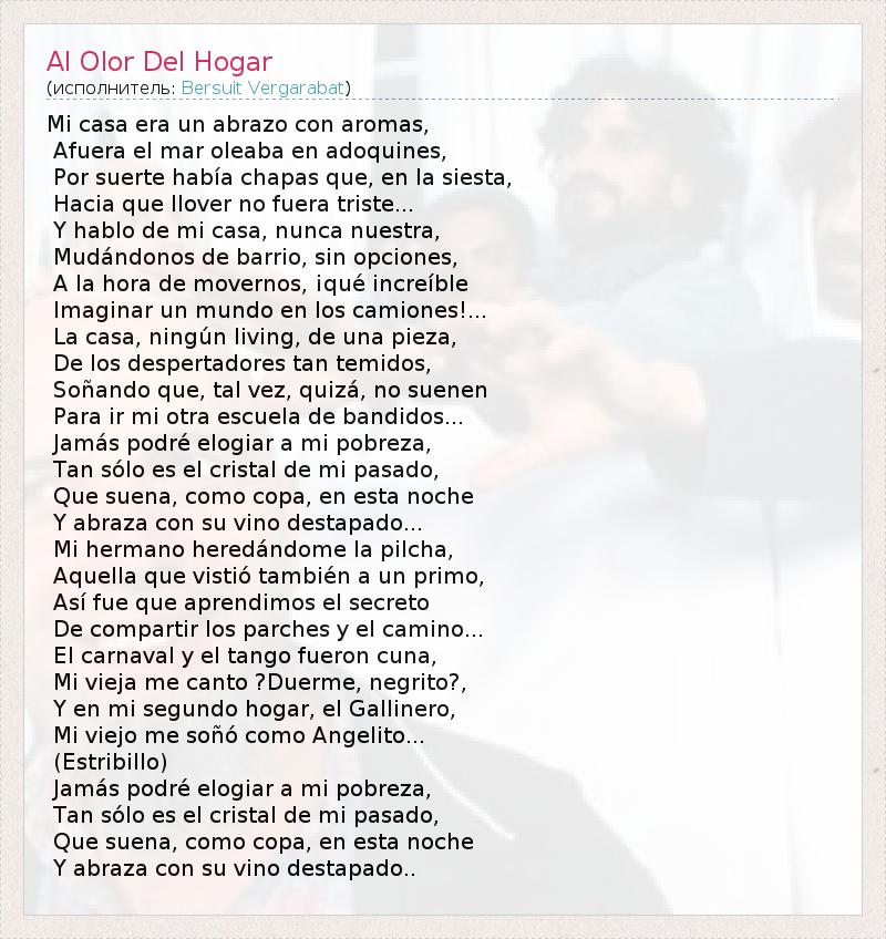 Mi Casa эпохи ООН Абрасо мошенники ароматы, Afuera El Mar oleaba ан adoquines, Пор Suerte Habia Чапас Que, En La Siesta, HACIA Que llover не Fuera Triste ... У hablo де Mi Casa, NUNCA Нуэстра, Mudándonos де Баррио, грех opciones, Ла-де-гора movernos, ¡qué Increible Imaginar ООН Mundo ан-лос-Camiones! ... Ла-Каса, ningún гостиная, де уна pieza, Де-лос-despertadores загар temidos, не Сонандо Que Таль Чавес, Квиза, не suenen Пара ИК миль Otra Эскуэла де Bandidos ... JAMAS podré elogiar миль pobreza, Tan Solo-эс-эль Cristal-де-ми Pasado, Que Suena, Комо Копа, ванная ЭСТА ночь У abraza кон су вино destapado ... Ми Hermano heredándome ла pilcha, Aquella Que vistió también A UN Primo, ASI ФРУ Que aprendimos эль Secreto Де-лос-Compartir parches у El Camino ... Эль карнавал у эль танго fueron CUNA, Ми-Вьеха мне песнь? Duerme, Negrito ?, У ванной миль Сегундо Hogar, эль Gallinero, Ми-Вьехо мне Sono Комо Angelito ... (Estribillo) JAMAS podré elogiar миль pobreza, Tan Solo-эс-эль Cristal-де-ми Pasado, Que Suena, Комо Копа, ванная ЭСТА ночь У abraza кон су вино destapado ..