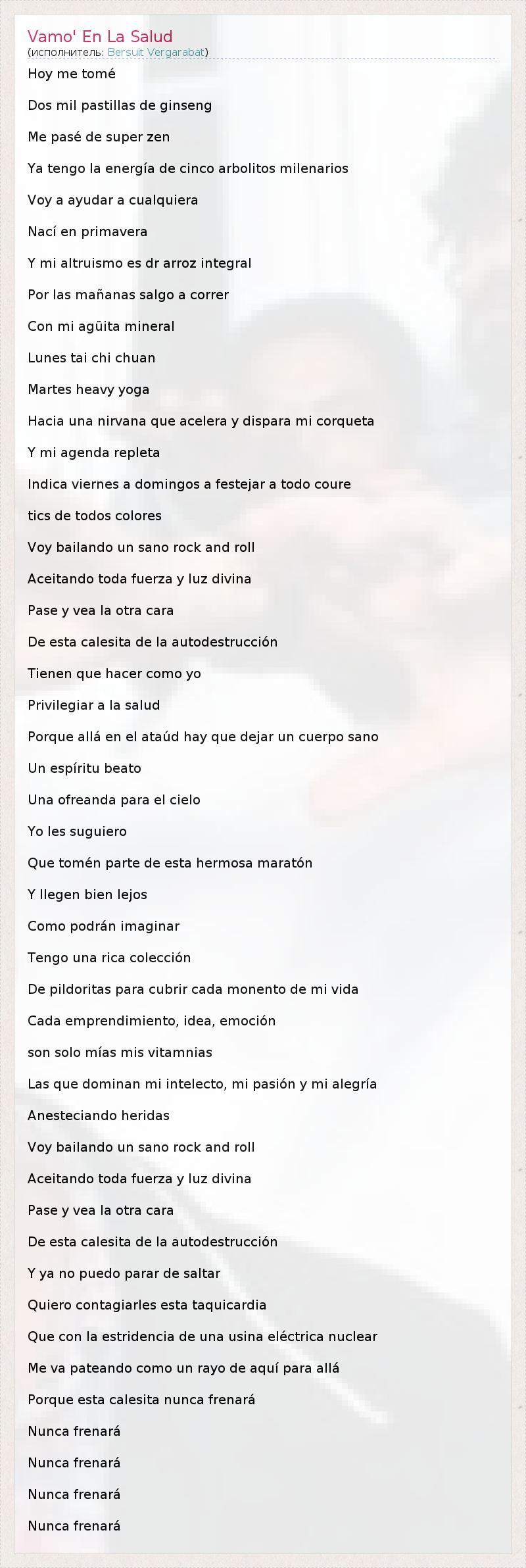 Hoy me tomé Dos mil pastillas de ginseng Me pasé de super zen Ya tengo la energía de cinco arbolitos milenarios Voy a ayudar a cualquiera Nací en primavera Y mi altruismo es dr arroz integral Por las mañanas salgo a correr Con mi agüita mineral Lunes tai chi chuan Martes heavy yoga Hacia una nirvana que acelera y dispara mi corqueta Y mi agenda repleta Indica viernes a domingos a festejar a todo coure tics de todos colores Voy bailando un sano rock and roll Aceitando toda fuerza y luz divina Pase y vea la otra cara De esta calesita de la autodestrucción Tienen que hacer como yo Privilegiar a la salud Porque allá en el ataúd hay que dejar un cuerpo sano Un espíritu beato Una ofreanda para el cielo Yo les suguiero Que tomén parte de esta hermosa maratón Y llegen bien lejos Como podrán imaginar Tengo una rica colección De pildoritas para cubrir cada monento de mi vida Cada emprendimiento, idea, emoción son solo mías mis vitamnias Las que dominan mi intelecto, mi pasión y mi alegría Anesteciando heridas Voy bailando un sano rock and roll Aceitando toda fuerza y luz divina Pase y vea la otra cara De esta calesita de la autodestrucción Y ya no puedo parar de saltar Quiero contagiarles esta taquicardia Que con la estridencia de una usina eléctrica nuclear Me va pateando como un rayo de aquí para allá Porque esta calesita nunca frenará Nunca frenará Nunca frenará Nunca frenará Nunca frenará