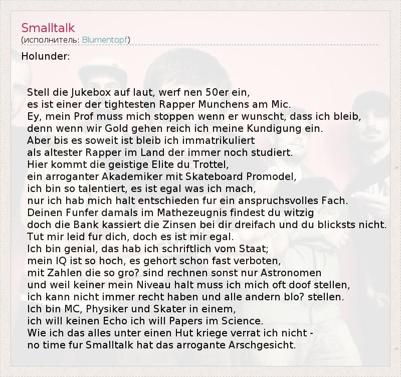 Это интересно:Мюнхен, Германия Blumentopf ("Цветочный горшок") хип-хоп группа из Мюнхена. Их первый альбом “Kein Zufall” (“Не случайно”) вышел в свет в 1997. В 2001 и 2002 гг. читатели журнала “Juice” признали их живые выступления самыми лучшими. Слушатели ценят эту группу за глубокое содержание текстов песен. Однако их популярность и коммерческий успех никогда не достигали уровня других немецких... продолжение