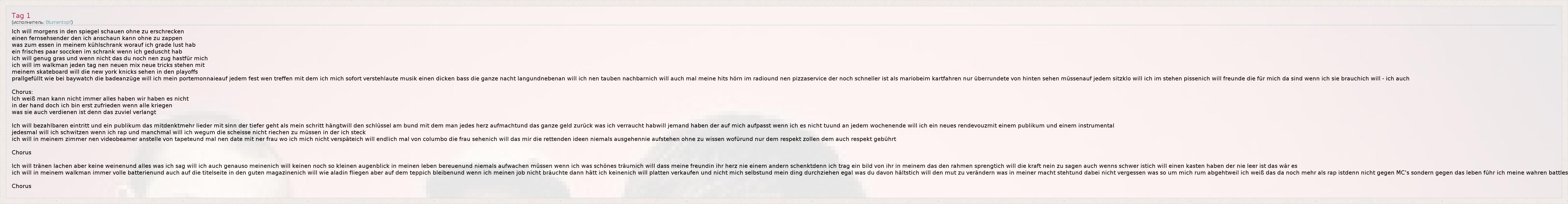 Ich will tränen lachen aber keine weinenund alles was ich sag will ich auch genauso meinenich will keinen noch so kleinen augenblick in meinen leben bereuenund niemals aufwachen müssen wenn ich was schönes träumich will dass meine freundin ihr herz nie einem andern schenktdenn ich trag ein bild von ihr in meinem das den rahmen sprengtich will die kraft nein zu sagen auch wenns schwer istich will einen kasten haben der nie leer ist das wär es