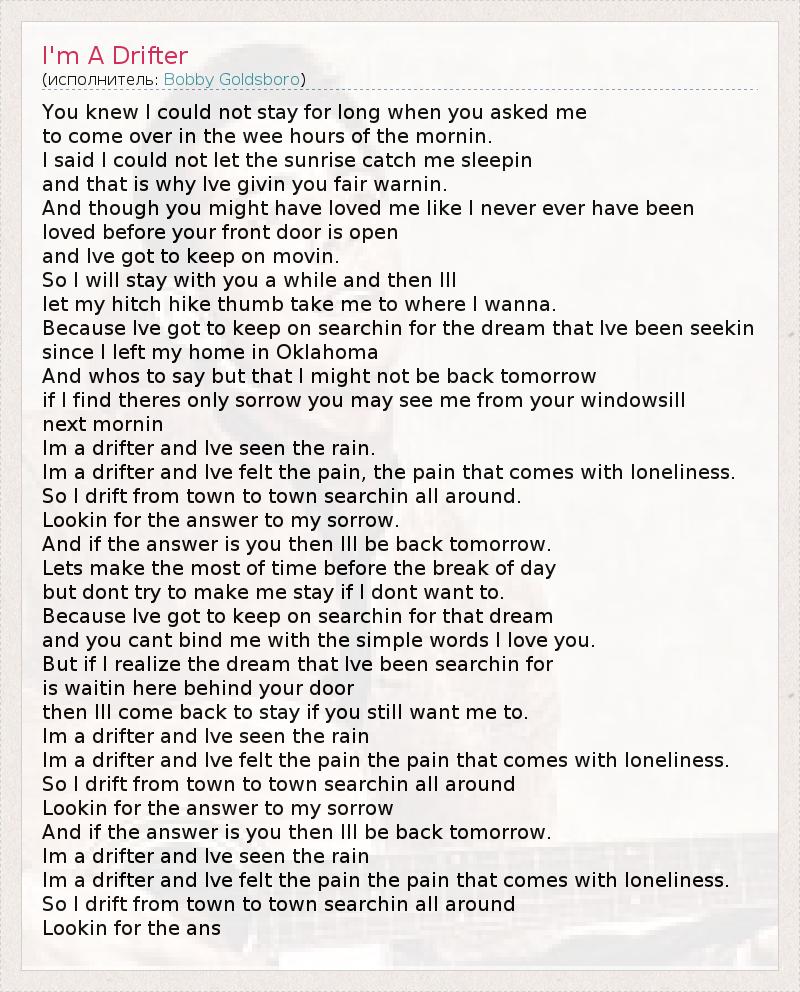 You knew I could not stay for long when you asked me to come over in the wee hours of the mornin. I said I could not let the sunrise catch me sleepin and that is why Ive givin you fair warnin. And though you might have loved me like I never ever have been loved before your front door is open and Ive got to keep on movin. So I will stay with you a while and then Ill let my hitch hike thumb take me to where I wanna. Because Ive got to keep on searchin for the dream that Ive been seekin since I left my home in Oklahoma And whos to say but that I might not be back tomorrow if I find theres only sorrow you may see me from your windowsill next mornin Im a drifter and Ive seen the rain. Im a drifter and Ive felt the pain, the pain that comes with loneliness. So I drift from town to town searchin all around. Lookin for the answer to my sorrow. And if the answer is you then Ill be back tomorrow. Lets make the most of time before the break of day but dont try to make me stay if I dont want to. Because Ive got to keep on searchin for that dream and you cant bind me with the simple words I love you. But if I realize the dream that Ive been searchin for is waitin here behind your door then Ill come back to stay if you still want me to. Im a drifter and Ive seen the rain Im a drifter and Ive felt the pain the pain that comes with loneliness. So I drift from town to town searchin all around Lookin for the answer to my sorrow And if the answer is you then Ill be back tomorrow. Im a drifter and Ive seen the rain Im a drifter and Ive felt the pain the pain that comes with loneliness. So I drift from town to town searchin all around Lookin for the ans