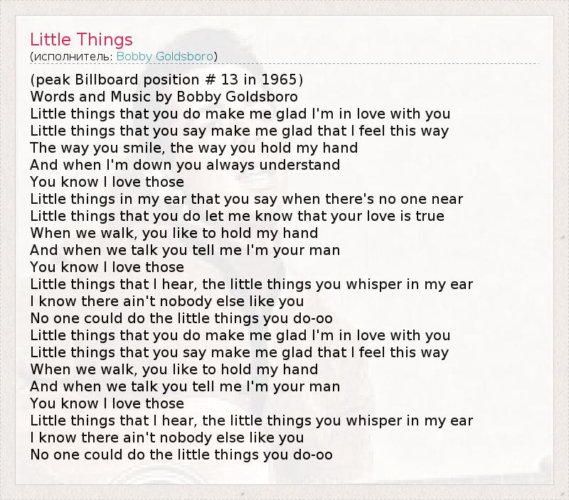 (peak Billboard position # 13 in 1965) Words and Music by Bobby Goldsboro Little things that you do make me glad I'm in love with you Little things that you say make me glad that I feel this way The way you smile, the way you hold my hand And when I'm down you always understand You know I love those Little things in my ear that you say when there's no one near Little things that you do let me know that your love is true When we walk, you like to hold my hand And when we talk you tell me I'm your man You know I love those Little things that I hear, the little things you whisper in my ear I know there ain't nobody else like you No one could do the little things you do-oo Little things that you do make me glad I'm in love with you Little things that you say make me glad that I feel this way When we walk, you like to hold my hand And when we talk you tell me I'm your man You know I love those Little things that I hear, the little things you whisper in my ear I know there ain't nobody else like you No one could do the little things you do-oo