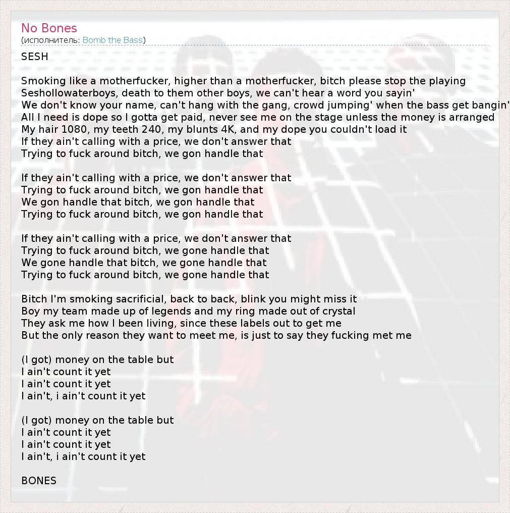 SESH Smoking like a motherfucker, higher than a motherfucker, bitch please stop the playing Seshollowaterboys, death to them other boys, we can't hear a word you sayin' We don't know your name, can't hang with the gang, crowd jumping' when the bass get bangin' All I need is dope so I gotta get paid, never see me on the stage unless the money is arranged My hair 1080, my teeth 240, my blunts 4K, and my dope you couldn't load it If they ain't calling with a price, we don't answer that Trying to fuck around bitch, we gon handle that If they ain't calling with a price, we don't answer that Trying to fuck around bitch, we gon handle that We gon handle that bitch, we gon handle that Trying to fuck around bitch, we gon handle that If they ain't calling with a price, we don't answer that Trying to fuck around bitch, we gone handle that We gone handle that bitch, we gone handle that Trying to fuck around bitch, we gone handle that Bitch I'm smoking sacrificial, back to back, blink you might miss it Boy my team made up of legends and my ring made out of crystal They ask me how I been living, since these labels out to get me But the only reason they want to meet me, is just to say they fucking met me (I got) money on the table but I ain't count it yet I ain't count it yet I ain't, i ain't count it yet (I got) money on the table but I ain't count it yet I ain't count it yet I ain't, i ain't count it yet BONES
