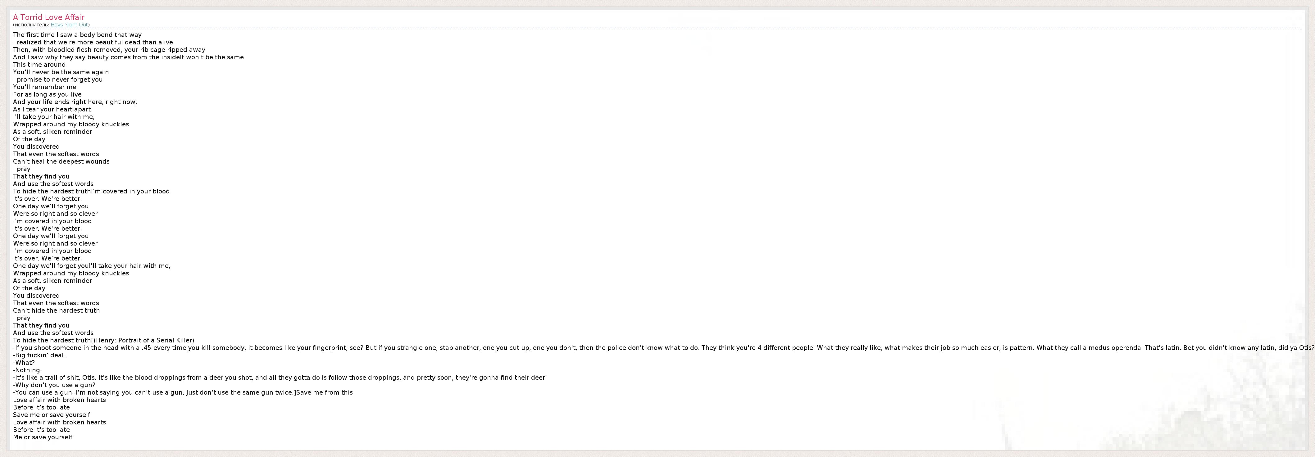 А как ты думаешь, о чем песня "A Torrid Love Affair" ?
