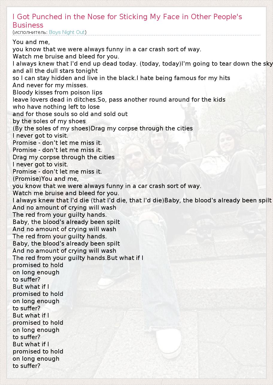 А как ты думаешь, о чем песня "I Got Punched in the Nose for Sticking My Face in Other People's Business" ?