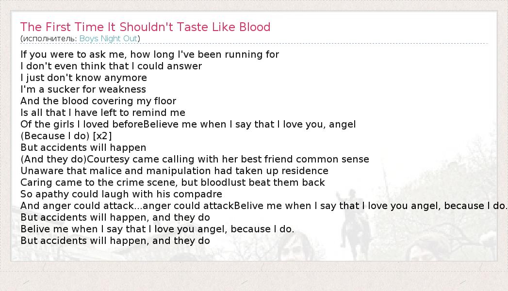 А как ты думаешь, о чем песня "The First Time It Shouldn't Taste Like Blood" ?