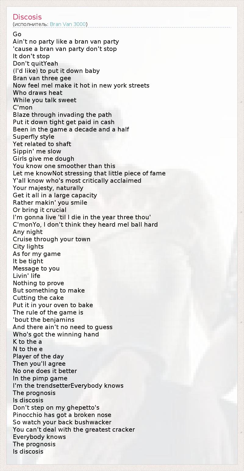 Это интересно:Bran Van 3000 (also known as Bran Van and BV3) is an electronica collective from Montreal, Canada. Founded by DJ James Di Salvio and E.P. Bergen, they collaborated on a number of songs with Stéphane Moraille, Sara Johnston, Steve "Liquid" Hawley, Jayne Hill, Québécois rock star Jean Leloup and other musicians.HistoryJames Di Salvio and E.P. Bergen got together in Manhattan and coined Bran Van 3000 in 1994. Di Salvio was a video director and asked E.P. to come teach him how to produce tracks with a sampler and turntables. Together they went and bought studio equipment in Times Square. E.P. returned to Montreal and immediately co-wrote/produced a single with Jean Leloup called:... продолжение
