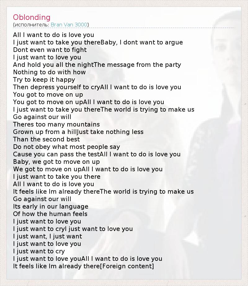 All I want to do is love you I just want to take you thereBaby, I dont want to argue Dont even want to fight I just want to love you And hold you all the nightThe message from the party Nothing to do with how Try to keep it happy Then depress yourself to cryAll I want to do is love you You got to move on up You got to move on upAll I want to do is love you I just want to take you thereThe world is trying to make us Go against our will Theres too many mountains Grown up from a hillJust take nothing less Than the second best Do not obey what most people say Cause you can pass the testAll I want to do is love you Baby, we got to move on up We got to move on upAll I want to do is love you I just want to take you there All I want to do is love you It feels like Im already thereThe world is trying to make us Go against our will Its early in our language Of how the human feels I just want to love you I just want to cryI just want to love you I just want, I just want I just want to love you I just want to cry I just want to love youAll I want to do is love you It feels like Im already there[Foreign content]
