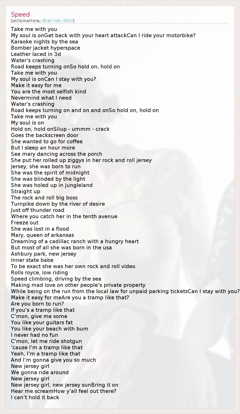 Это интересно:Bran Van 3000 (also known as Bran Van and BV3) is an electronica collective from Montreal, Canada. Founded by DJ James Di Salvio and E.P. Bergen, they collaborated on a number of songs with Stéphane Moraille, Sara Johnston, Steve "Liquid" Hawley, Jayne Hill, Québécois rock star Jean Leloup and other musicians.HistoryJames Di Salvio and E.P. Bergen got together in Manhattan and coined Bran Van 3000 in 1994. Di Salvio was a video director and asked E.P. to come teach him how to produce tracks with a sampler and turntables. Together they went and bought studio equipment in Times Square. E.P. returned to Montreal and immediately co-wrote/produced a single with Jean Leloup called:... продолжение