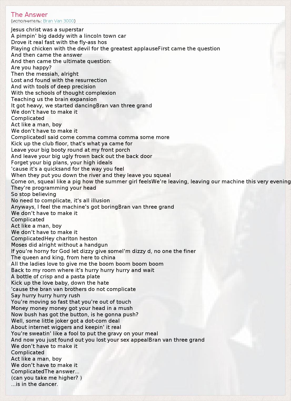 Это интересно:Bran Van 3000 (also known as Bran Van and BV3) is an electronica collective from Montreal, Canada. Founded by DJ James Di Salvio and E.P. Bergen, they collaborated on a number of songs with Stéphane Moraille, Sara Johnston, Steve "Liquid" Hawley, Jayne Hill, Québécois rock star Jean Leloup and other musicians.HistoryJames Di Salvio and E.P. Bergen got together in Manhattan and coined Bran Van 3000 in 1994. Di Salvio was a video director and asked E.P. to come teach him how to produce tracks with a sampler and turntables. Together they went and bought studio equipment in Times Square. E.P. returned to Montreal and immediately co-wrote/produced a single with Jean Leloup called:... продолжение