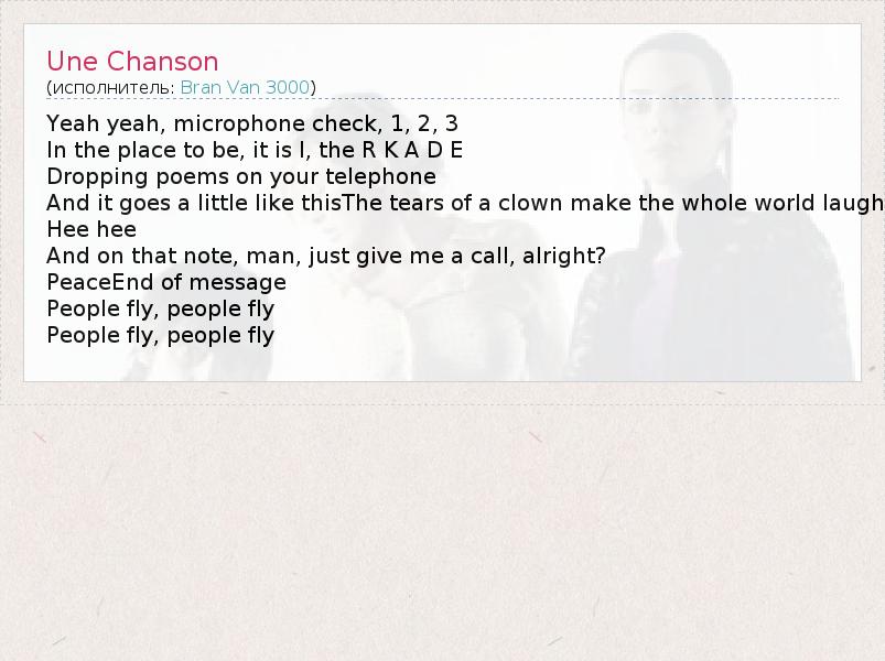 Yeah yeah, microphone check, 1, 2, 3 In the place to be, it is I, the R K A D E Dropping poems on your telephone And it goes a little like thisThe tears of a clown make the whole world laugh Hee hee And on that note, man, just give me a call, alright? PeaceEnd of message People fly, people fly People fly, people fly