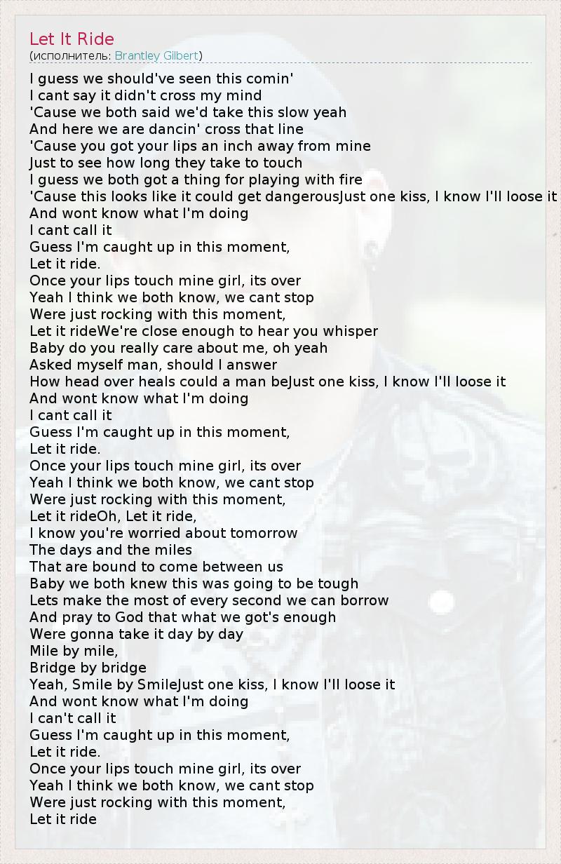 I guess we should've seen this comin' I cant say it didn't cross my mind 'Cause we both said we'd take this slow yeah And here we are dancin' cross that line 'Cause you got your lips an inch away from mine Just to see how long they take to touch I guess we both got a thing for playing with fire 'Cause this looks like it could get dangerousJust one kiss, I know I'll loose it And wont know what I'm doing I cant call it Guess I'm caught up in this moment, Let it ride. Once your lips touch mine girl, its over Yeah I think we both know, we cant stop Were just rocking with this moment, Let it rideWe're close enough to hear you whisper Baby do you really care about me, oh yeah Asked myself man, should I answer How head over heals could a man beJust one kiss, I know I'll loose it And wont know what I'm doing I cant call it Guess I'm caught up in this moment, Let it ride. Once your lips touch mine girl, its over Yeah I think we both know, we cant stop Were just rocking with this moment, Let it rideOh, Let it ride, I know you're worried about tomorrow The days and the miles That are bound to come between us Baby we both knew this was going to be tough Lets make the most of every second we can borrow And pray to God that what we got's enough Were gonna take it day by day Mile by mile, Bridge by bridge Yeah, Smile by SmileJust one kiss, I know I'll loose it And wont know what I'm doing I can't call it Guess I'm caught up in this moment, Let it ride. Once your lips touch mine girl, its over Yeah I think we both know, we cant stop Were just rocking with this moment, Let it ride