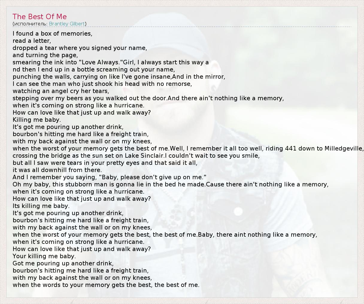 I found a box of memories, read a letter, dropped a tear where you signed your name, and turning the page, smearing the ink into "Love Always."Girl, I always start this way a nd then I end up in a bottle screaming out your name, punching the walls, carrying on like I've gone insane,And in the mirror, I can see the man who just shook his head with no remorse, watching an angel cry her tears, stepping over my beers as you walked out the door.And there ain't nothing like a memory, when it's coming on strong like a hurricane. How can love like that just up and walk away? Killing me baby. It's got me pouring up another drink, bourbon's hitting me hard like a freight train, with my back against the wall or on my knees, when the worst of your memory gets the best of me.Well, I remember it all too well, riding 441 down to Milledgeville, crossing the bridge as the sun set on Lake Sinclair.I couldn't wait to see you smile, but all I saw were tears in your pretty eyes and that said it all, it was all downhill from there. And I remember you saying, "Baby, please don't give up on me." Oh my baby, this stubborn man is gonna lie in the bed he made.Cause there ain't nothing like a memory, when it's coming on strong like a hurricane. How can love like that just up and walk away? Its killing me baby. It's got me pouring up another drink, bourbon's hitting me hard like a freight train, with my back against the wall or on my knees, when the worst of your memory gets the best, the best of me.Baby, there aint nothing like a memory, when it's coming on strong like a hurricane. How can love like that just up and walk away? Your killing me baby. Got me pouring up another drink, bourbon's hitting me hard like a freight train, with my back against the wall or on my knees, when the words to your memory gets the best, the best of me.