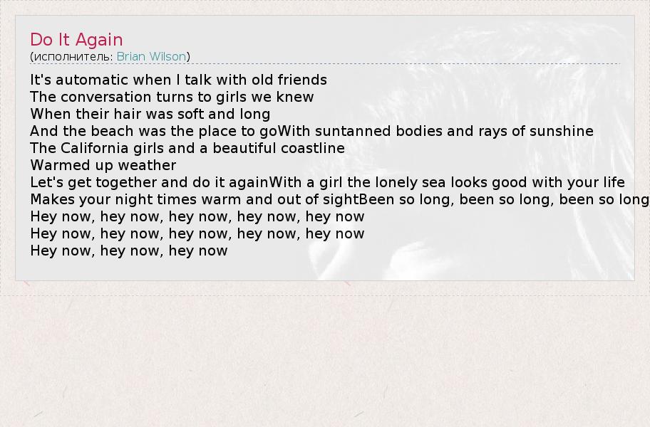 Это интересно:Брайан Уилсон (род. 20.06.1942) - американский музыкант, основатель и вдохновитель группы Beach Boys. Как судьба любого гения, судьба Брайана трагична. Вследствии внутреннего дуализма, он провел много лет в добровольном изгнании с диагнозом "шизофрения". За 1967-1989 года Брайан практически молчал и ничего не делал. Сейчас он пришел в себя, о чем свидетельствует и название его альбома 2008 года - That... продолжение