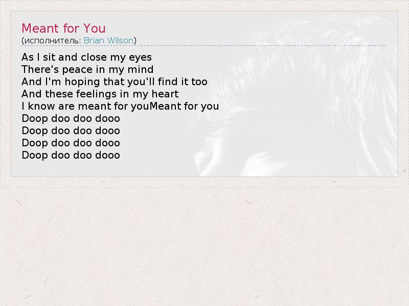 Это интересно:Брайан Уилсон (род. 20.06.1942) - американский музыкант, основатель и вдохновитель группы Beach Boys. Как судьба любого гения, судьба Брайана трагична. Вследствии внутреннего дуализма, он провел много лет в добровольном изгнании с диагнозом "шизофрения". За 1967-1989 года Брайан практически молчал и ничего не делал. Сейчас он пришел в себя, о чем свидетельствует и название его альбома 2008 года - That... продолжение
