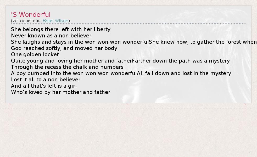 Это интересно:Брайан Уилсон (род. 20.06.1942) - американский музыкант, основатель и вдохновитель группы Beach Boys. Как судьба любого гения, судьба Брайана трагична. Вследствии внутреннего дуализма, он провел много лет в добровольном изгнании с диагнозом "шизофрения". За 1967-1989 года Брайан практически молчал и ничего не делал. Сейчас он пришел в себя, о чем свидетельствует и название его альбома 2008 года - That... продолжение
