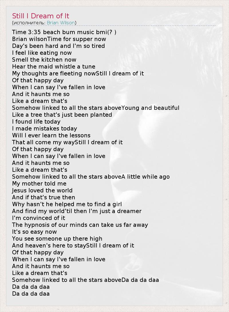 Time 3:35 beach bum music bmi(? ) Brian wilsonTime for supper now Day's been hard and I'm so tired I feel like eating now Smell the kitchen now Hear the maid whistle a tune My thoughts are fleeting nowStill I dream of it Of that happy day When I can say I've fallen in love And it haunts me so Like a dream that's Somehow linked to all the stars aboveYoung and beautiful Like a tree that's just been planted I found life today I made mistakes today Will I ever learn the lessons That all come my wayStill I dream of it Of that happy day When I can say I've fallen in love And it haunts me so Like a dream that's Somehow linked to all the stars aboveA little while ago My mother told me Jesus loved the world And if that's true then Why hasn't he helped me to find a girl And find my world'til then I'm just a dreamer I'm convinced of it The hypnosis of our minds can take us far away It's so easy now You see someone up there high And heaven's here to stayStill I dream of it Of that happy day When I can say I've fallen in love And it haunts me so Like a dream that's Somehow linked to all the stars aboveDa da da daa Da da da daa Da da da daa