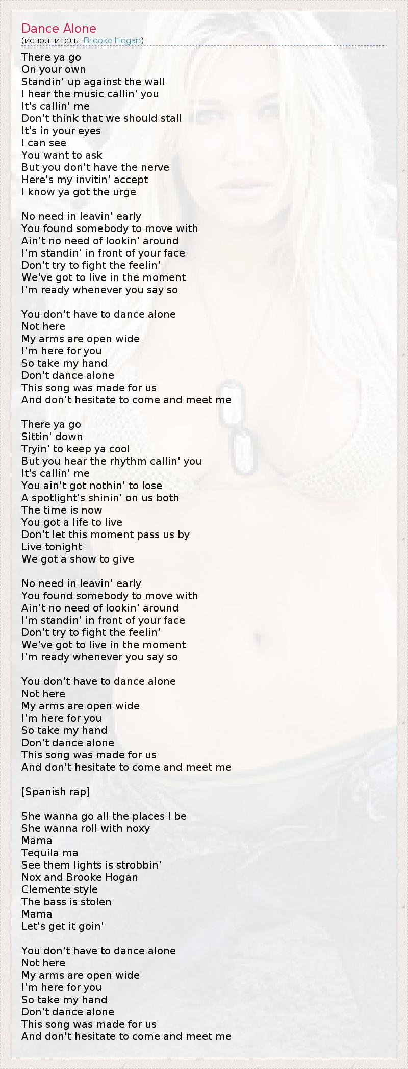 There ya go On your own Standin' up against the wall I hear the music callin' you It's callin' me Don't think that we should stall It's in your eyes I can see You want to ask But you don't have the nerve Here's my invitin' accept I know ya got the urge No need in leavin' early You found somebody to move with Ain't no need of lookin' around I'm standin' in front of your face Don't try to fight the feelin' We've got to live in the moment I'm ready whenever you say so You don't have to dance alone Not here My arms are open wide I'm here for you So take my hand Don't dance alone This song was made for us And don't hesitate to come and meet me There ya go Sittin' down Tryin' to keep ya cool But you hear the rhythm callin' you It's callin' me You ain't got nothin' to lose A spotlight's shinin' on us both The time is now You got a life to live Don't let this moment pass us by Live tonight We got a show to give No need in leavin' early You found somebody to move with Ain't no need of lookin' around I'm standin' in front of your face Don't try to fight the feelin' We've got to live in the moment I'm ready whenever you say so You don't have to dance alone Not here My arms are open wide I'm here for you So take my hand Don't dance alone This song was made for us And don't hesitate to come and meet me [Spanish rap] She wanna go all the places I be She wanna roll with noxy Mama Tequila ma See them lights is strobbin' Nox and Brooke Hogan Clemente style The bass is stolen Mama Let's get it goin' You don't have to dance alone Not here My arms are open wide I'm here for you So take my hand Don't dance alone This song was made for us And don't hesitate to come and meet me