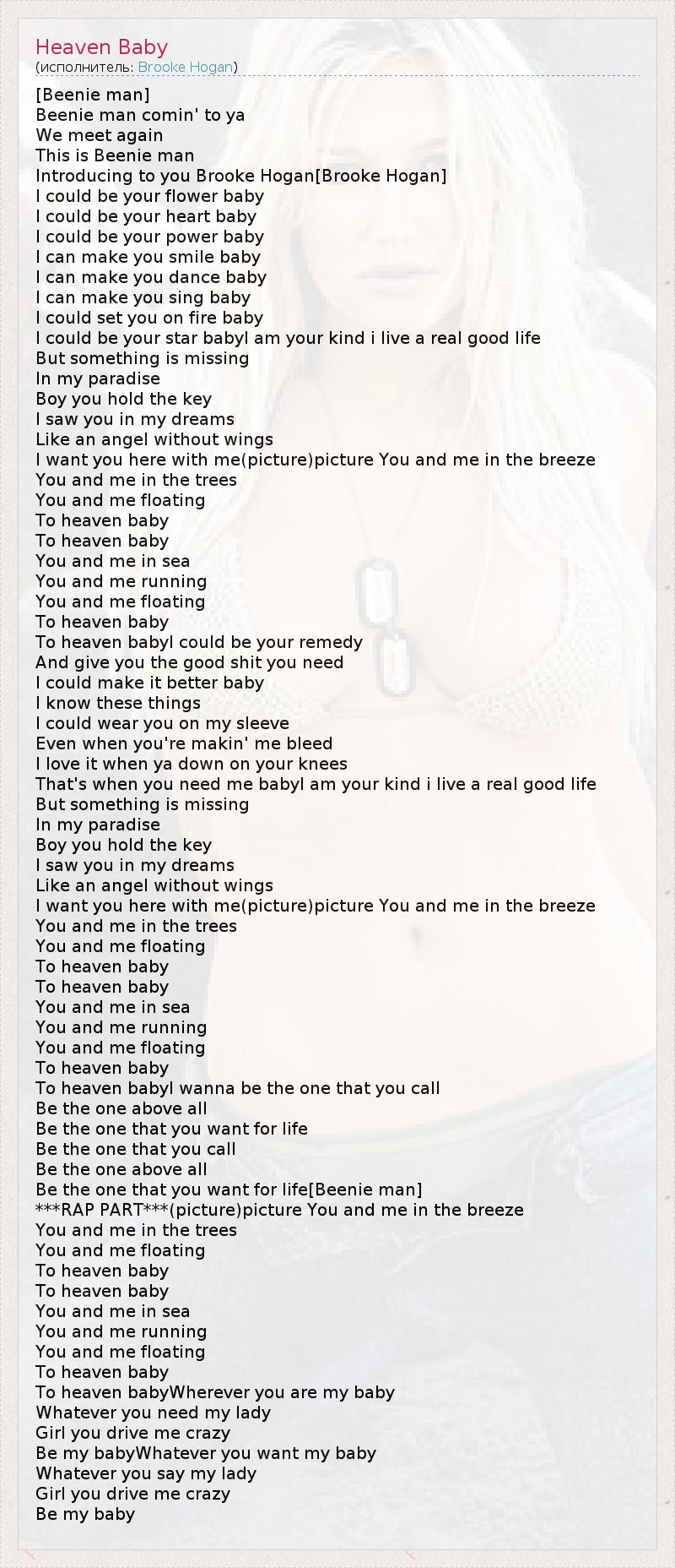 [Beenie man] Beenie man comin' to ya We meet again This is Beenie man Introducing to you Brooke Hogan[Brooke Hogan] I could be your flower baby I could be your heart baby I could be your power baby I can make you smile baby I can make you dance baby I can make you sing baby I could set you on fire baby I could be your star babyI am your kind i live a real good life But something is missing In my paradise Boy you hold the key I saw you in my dreams Like an angel without wings I want you here with me(picture)picture You and me in the breeze You and me in the trees You and me floating To heaven baby To heaven baby You and me in sea You and me running You and me floating To heaven baby To heaven babyI could be your remedy And give you the good shit you need I could make it better baby I know these things I could wear you on my sleeve Even when you're makin' me bleed I love it when ya down on your knees That's when you need me babyI am your kind i live a real good life But something is missing In my paradise Boy you hold the key I saw you in my dreams Like an angel without wings I want you here with me(picture)picture You and me in the breeze You and me in the trees You and me floating To heaven baby To heaven baby You and me in sea You and me running You and me floating To heaven baby To heaven babyI wanna be the one that you call Be the one above all Be the one that you want for life Be the one that you call Be the one above all Be the one that you want for life[Beenie man] ***RAP PART***(picture)picture You and me in the breeze You and me in the trees You and me floating To heaven baby To heaven baby You and me in sea You and me running You and me floating To heaven baby To heaven babyWherever you are my baby Whatever you need my lady Girl you drive me crazy Be my babyWhatever you want my baby Whatever you say my lady Girl you drive me crazy Be my baby