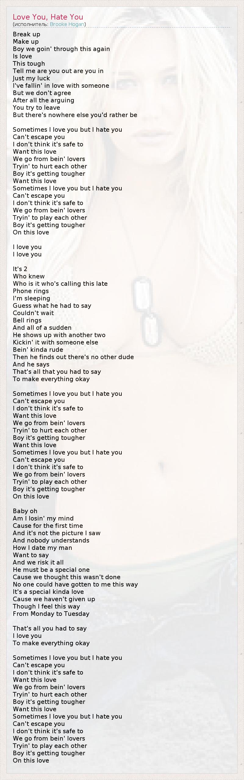 Break up Make up Boy we goin' through this again Is love This tough Tell me are you out are you in Just my luck I've fallin' in love with someone But we don't agree After all the arguing You try to leave But there's nowhere else you'd rather be Sometimes I love you but I hate you Can't escape you I don't think it's safe to Want this love We go from bein' lovers Tryin' to hurt each other Boy it's getting tougher Want this love Sometimes I love you but I hate you Can't escape you I don't think it's safe to We go from bein' lovers Tryin' to play each other Boy it's getting tougher On this love I love you I love you It's 2 Who knew Who is it who's calling this late Phone rings I'm sleeping Guess what he had to say Couldn't wait Bell rings And all of a sudden He shows up with another two Kickin' it with someone else Bein' kinda rude Then he finds out there's no other dude And he says That's all that you had to say To make everything okay Sometimes I love you but I hate you Can't escape you I don't think it's safe to Want this love We go from bein' lovers Tryin' to hurt each other Boy it's getting tougher Want this love Sometimes I love you but I hate you Can't escape you I don't think it's safe to We go from bein' lovers Tryin' to play each other Boy it's getting tougher On this love Baby oh Am I losin' my mind Cause for the first time And it's not the picture I saw And nobody understands How I date my man Want to say And we risk it all He must be a special one Cause we thought this wasn't done No one could have gotten to me this way It's a special kinda love Cause we haven't given up Though I feel this way From Monday to Tuesday That's all you had to say I love you To make everything okay Sometimes I love you but I hate you Can't escape you I don't think it's safe to Want this love We go from bein' lovers Tryin' to hurt each other Boy it's getting tougher Want this love Sometimes I love you but I hate you Can't escape you I don't think it's safe to We go from bein' lovers Tryin' to play each other Boy it's getting tougher On this love