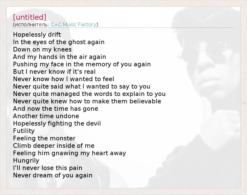 Hopelessly drift In the eyes of the ghost again Down on my knees And my hands in the air again Pushing my face in the memory of you again But I never know if it's real Never know how I wanted to feel Never quite said what I wanted to say to you Never quite managed the words to explain to you Never quite knew how to make them believable And now the time has gone Another time undone Hopelessly fighting the devil Futility Feeling the monster Climb deeper inside of me Feeling him gnawing my heart away Hungrily I'll never lose this pain Never dream of you again