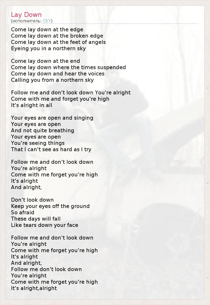 Come lay down at the edge Come lay down at the broken edge Come lay down at the feet of angels Eyeing you in a northern sky Come lay down at the end Come lay down where the times suspended Come lay down and hear the voices Calling you from a northern sky Follow me and don't look down You're alright Come with me and forget you're high It's alright in all Your eyes are open and singing Your eyes are open And not quite breathing Your eyes are open You're seeing things That I can't see as hard as I try Follow me and don't look down You're alright Come with me forget you're high It's alright And alright, Don't look down Keep your eyes off the ground So afraid These days will fall Like tears down your face Follow me and don't look down You're alright Come with me forget you're high It's alright And alright, Follow me don't look down You're alright Come with me forget you're high It's alright,alright