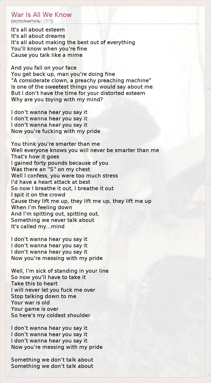 Всё дело в репутации, Всё дело в мечтах, Всё дело в том, чтобы всё делать на пределе своих возможностей. Ты поймёшь, когда тебе хорошо, Ведь ты разговариваешь, как мим. Ты падаешь навзничь, Затем снова поднимаешься - чувак, всё отлично! "Серьёзный клоун, любящая читать нравоучения проповедующая машина", - Это одна из самых милых вещей, которые ты можешь сказать обо мне. Но у меня нет времени на твою искажённую оценку. Почему ты морочишь мне голову? Я не хочу слышать этого от тебя! Я не хочу слышать этого от тебя! Я не хочу слышать этого от тебя! Теперь ты имеешь дело с моей гордостью! Ты думаешь, что умнее меня, Но все знают, что ты никогда не станешь умнее - Вот такие пироги. Я набрал из-за тебя почти 20 кг! Хотя до этого считал себя суперменом. Приходится признать, ты доставила немало проблем, Я бы скорее выбрал сердечный приступ. А сейчас я выдыхаю, я выдыхаю И выплёскиваю злость в толпу, Потому что она меня вдохновляет, вдохновляет, вдохновляет, Когда на душе кошки скребут... И я выговариваюсь, высказываю то, О чём мы с тобой никогда не говорим, То есть я говорю то, что у меня... на уме! Я не хочу слышать этого от тебя! Я не хочу слышать этого от тебя! Я не хочу слышать этого от тебя! Теперь ты имеешь дело с моей гордостью! Мне надоело жить по твоим законам, Теперь тебе придётся принять это. Учти, Я никогда не позволю тебе объеб*ть себя, Хватит говорить со мной свысока. Ты давно в состоянии войны со мной, Твоя игра окончена, Так что вот тебе моё полнейшее пренебрежение... Я не хочу слышать этого от тебя! Я не хочу слышать этого от тебя! Я не хочу слышать этого от тебя! Теперь ты имеешь дело с моей гордостью! То, о чём мы с тобой никогда не говорим, То, о чём мы с тобой никогда не говорим...