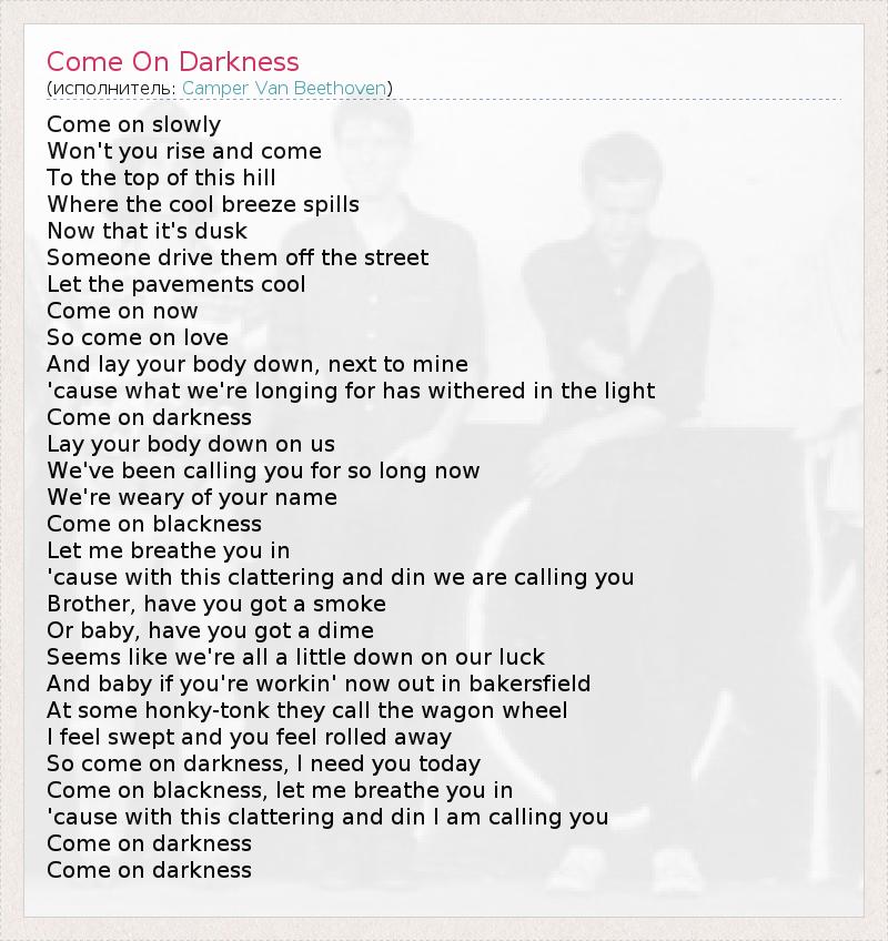 Come on slowly Won't you rise and come To the top of this hill Where the cool breeze spills Now that it's dusk Someone drive them off the street Let the pavements cool Come on now So come on love And lay your body down, next to mine 'cause what we're longing for has withered in the light Come on darkness Lay your body down on us We've been calling you for so long now We're weary of your name Come on blackness Let me breathe you in 'cause with this clattering and din we are calling you Brother, have you got a smoke Or baby, have you got a dime Seems like we're all a little down on our luck And baby if you're workin' now out in bakersfield At some honky-tonk they call the wagon wheel I feel swept and you feel rolled away So come on darkness, I need you today Come on blackness, let me breathe you in 'cause with this clattering and din I am calling you Come on darkness Come on darkness