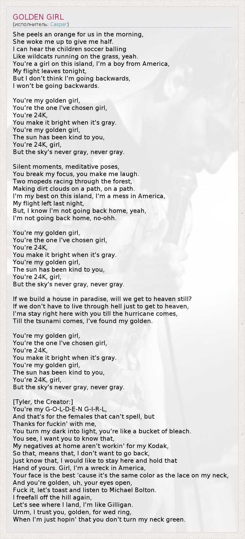 She peels an orange for us in the morning, She woke me up to give me half. I can hear the children soccer balling Like wildcats running on the grass, yeah. You're a girl on this island, I'm a boy from America, My flight leaves tonight, But I don't think I'm going backwards, I won't be going backwards. You're my golden girl, You're the one I've chosen girl, You're 24K, You make it bright when it's gray. You're my golden girl, The sun has been kind to you, You're 24K, girl, But the sky's never gray, never gray. Silent moments, meditative poses, You break my focus, you make me laugh. Two mopeds racing through the forest, Making dirt clouds on a path, on a path. I'm my best on this island, I'm a mess in America, My flight left last night, But, I know I'm not going back home, yeah, I'm not going back home, no-ohh. You're my golden girl, You're the one I've chosen girl, You're 24K, You make it bright when it's gray. You're my golden girl, The sun has been kind to you, You're 24K, girl, But the sky's never gray, never gray. If we build a house in paradise, will we get to heaven still? If we don't have to live through hell just to get to heaven, I'ma stay right here with you till the hurricane comes, Till the tsunami comes, I've found my golden. You're my golden girl, You're the one I've chosen girl, You're 24K, You make it bright when it's gray. You're my golden girl, The sun has been kind to you, You're 24K, girl, But the sky's never gray, never gray. [Tyler, the Creator:] You're my G-O-L-D-E-N G-I-R-L, And that's for the females that can't spell, but Thanks for fuckin' with me, You turn my dark into light, you're like a bucket of bleach. You see, I want you to know that, My negatives at home aren't workin' for my Kodak, So that, means that, I don't want to go back, Just know that, I would like to stay here and hold that Hand of yours. Girl, I'm a wreck in America, Your face is the best ‘cause it's the same color as the lace on my neck, And you're golden, uh, your eyes open, Fuck it, let's toast and listen to Michael Bolton. I freefall off the hill again, Let's see where I land, I'm like Gilligan. Umm, I trust you, golden, for wed ring, When I'm just hopin' that you don't turn my neck green.