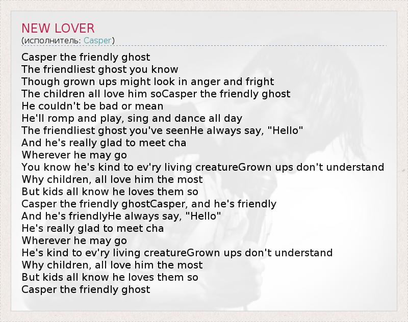 Casper the friendly ghost The friendliest ghost you know Though grown ups might look in anger and fright The children all love him soCasper the friendly ghost He couldn't be bad or mean He'll romp and play, sing and dance all day The friendliest ghost you've seenHe always say, "Hello" And he's really glad to meet cha Wherever he may go You know he's kind to ev'ry living creatureGrown ups don't understand Why children, all love him the most But kids all know he loves them so Casper the friendly ghostCasper, and he's friendly And he's friendlyHe always say, "Hello" He's really glad to meet cha Wherever he may go He's kind to ev'ry living creatureGrown ups don't understand Why children, all love him the most But kids all know he loves them so Casper the friendly ghost