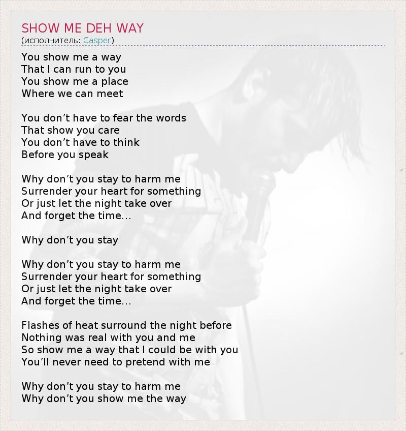 You show me a way That I can run to you You show me a place Where we can meet You don’t have to fear the words That show you care You don’t have to think Before you speak Why don’t you stay to harm me Surrender your heart for something Or just let the night take over And forget the time… Why don’t you stay Why don’t you stay to harm me Surrender your heart for something Or just let the night take over And forget the time… Flashes of heat surround the night before Nothing was real with you and me So show me a way that I could be with you You’ll never need to pretend with me Why don’t you stay to harm me Why don’t you show me the way