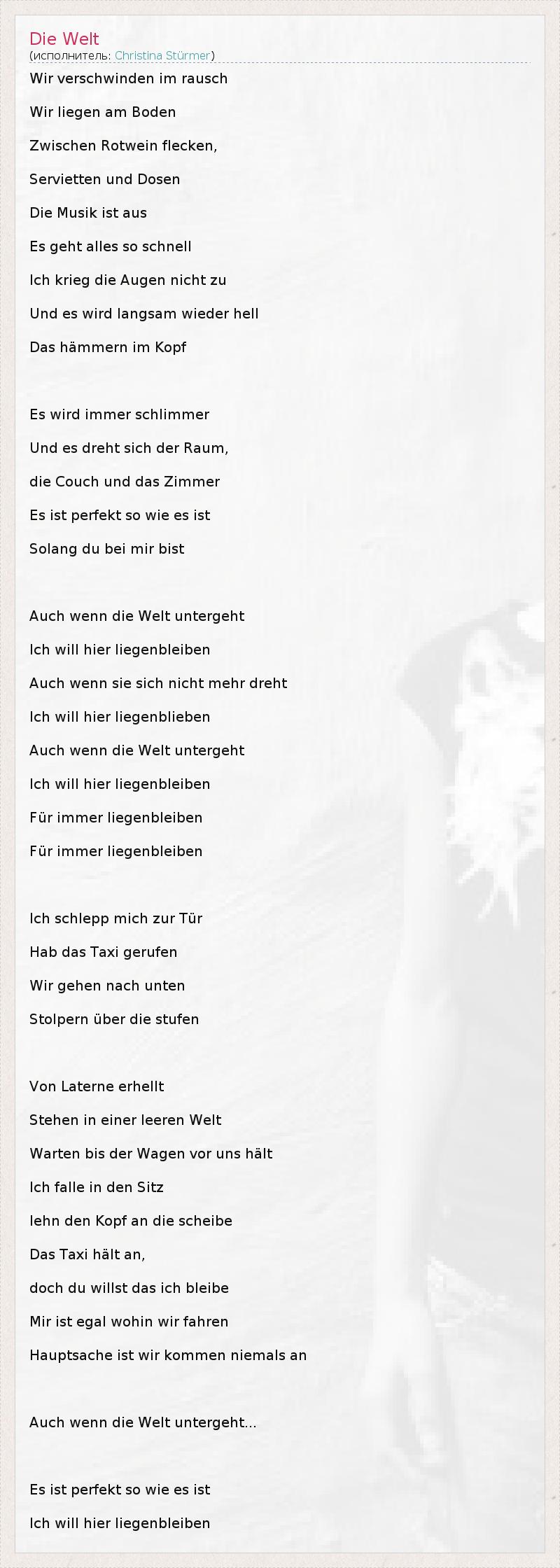 Wir verschwinden im rausch Wir liegen am Boden Zwischen Rotwein flecken, Servietten und Dosen Die Musik ist aus Es geht alles so schnell Ich krieg die Augen nicht zu Und es wird langsam wieder hell Das hämmern im Kopf Es wird immer schlimmer Und es dreht sich der Raum, die Couch und das Zimmer Es ist perfekt so wie es ist Solang du bei mir bist Auch wenn die Welt untergeht Ich will hier liegenbleiben Auch wenn sie sich nicht mehr dreht Ich will hier liegenblieben Auch wenn die Welt untergeht Ich will hier liegenbleiben Für immer liegenbleiben Für immer liegenbleiben Ich schlepp mich zur Tür Hab das Taxi gerufen Wir gehen nach unten Stolpern über die stufen Von Laterne erhellt Stehen in einer leeren Welt Warten bis der Wagen vor uns hält Ich falle in den Sitz lehn den Kopf an die scheibe Das Taxi hält an, doch du willst das ich bleibe Mir ist egal wohin wir fahren Hauptsache ist wir kommen niemals an Auch wenn die Welt untergeht... Es ist perfekt so wie es ist Ich will hier liegenbleiben