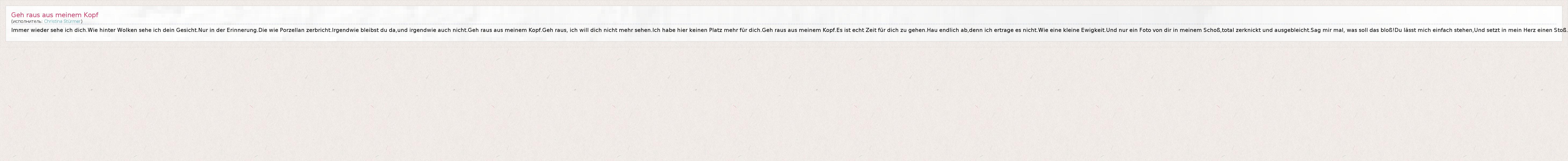 Immer wieder sehe ich dich.Wie hinter Wolken sehe ich dein Gesicht.Nur in der Erinnerung.Die wie Porzellan zerbricht.Irgendwie bleibst du da,und irgendwie auch nicht.Geh raus aus meinem Kopf.Geh raus, ich will dich nicht mehr sehen.Ich habe hier keinen Platz mehr für dich.Geh raus aus meinem Kopf.Es ist echt Zeit für dich zu gehen.Hau endlich ab,denn ich ertrage es nicht.Wie eine kleine Ewigkeit.Und nur ein Foto von dir in meinem Schoß,total zerknickt und ausgebleicht.Sag mir mal, was soll das bloß!Du lässt mich einfach stehen,Und setzt in mein Herz einen Stoß.