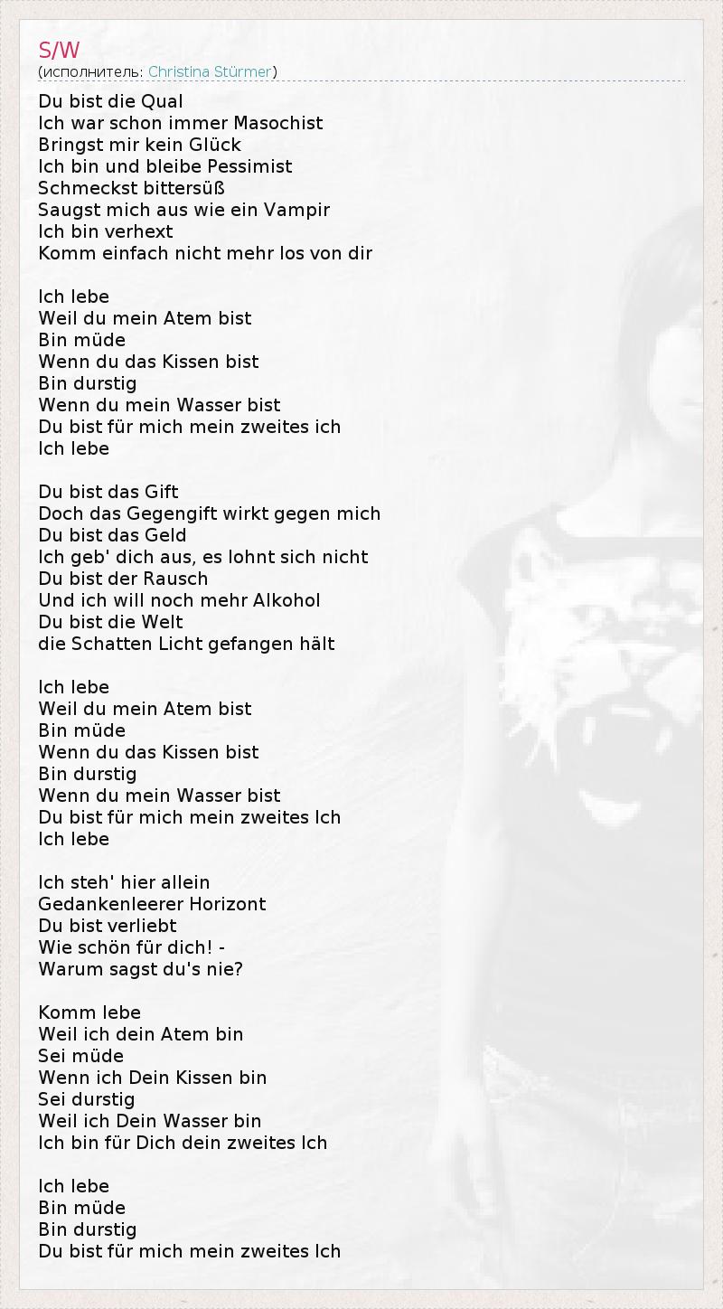 Это интересно:Эта миловидная брюнетка, подобно штурму, ворвалась в австрийские, немецкие и швейцарские хит-парады, ее концерты собирают тысячи поклонников, радиостанции с удовольствием крутят ее песни, и она очень комфортно чувствует себя в новой роли – в роли звезды, так как больше всего в этой жизни любит музыку. А еще ей нравится кино, хороший кофе, пицца, водка и Паоло Коэльо. Кристина Штюрмер является... продолжение