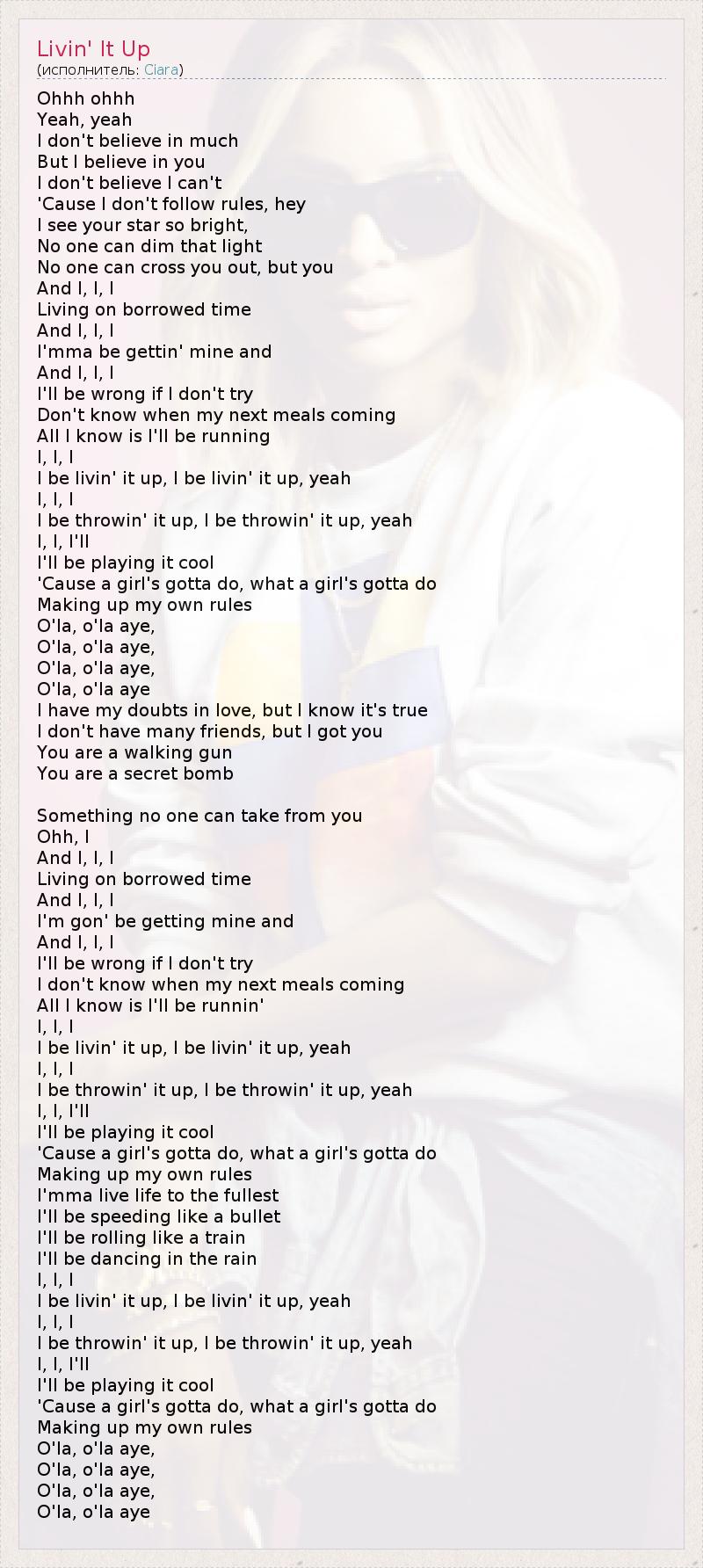 Ohhh ohhh Yeah, yeah I don't believe in much But I believe in you I don't believe I can't 'Cause I don't follow rules, hey I see your star so bright, No one can dim that light No one can cross you out, but you And I, I, I Living on borrowed time And I, I, I I'mma be gettin' mine and And I, I, I I'll be wrong if I don't try Don't know when my next meals coming All I know is I'll be running I, I, I I be livin' it up, I be livin' it up, yeah I, I, I I be throwin' it up, I be throwin' it up, yeah I, I, I'll I'll be playing it cool 'Cause a girl's gotta do, what a girl's gotta do Making up my own rules O'la, o'la aye, O'la, o'la aye, O'la, o'la aye, O'la, o'la aye I have my doubts in love, but I know it's true I don't have many friends, but I got you You are a walking gun You are a secret bomb Something no one can take from you Ohh, I And I, I, I Living on borrowed time And I, I, I I'm gon' be getting mine and And I, I, I I'll be wrong if I don't try I don't know when my next meals coming All I know is I'll be runnin' I, I, I I be livin' it up, I be livin' it up, yeah I, I, I I be throwin' it up, I be throwin' it up, yeah I, I, I'll I'll be playing it cool 'Cause a girl's gotta do, what a girl's gotta do Making up my own rules I'mma live life to the fullest I'll be speeding like a bullet I'll be rolling like a train I'll be dancing in the rain I, I, I I be livin' it up, I be livin' it up, yeah I, I, I I be throwin' it up, I be throwin' it up, yeah I, I, I'll I'll be playing it cool 'Cause a girl's gotta do, what a girl's gotta do Making up my own rules O'la, o'la aye, O'la, o'la aye, O'la, o'la aye, O'la, o'la aye