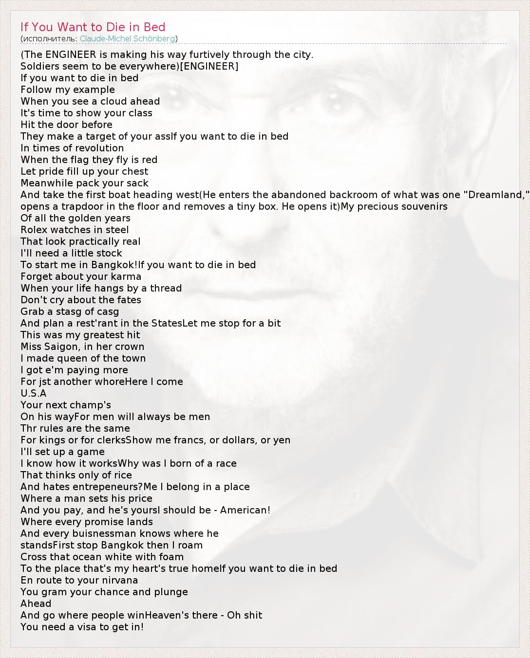 (The ENGINEER is making his way furtively through the city. Soldiers seem to be everywhere)[ENGINEER] If you want to die in bed Follow my example When you see a cloud ahead It's time to show your class Hit the door before They make a target of your assIf you want to die in bed In times of revolution When the flag they fly is red Let pride fill up your chest Meanwhile pack your sack And take the first boat heading west(He enters the abandoned backroom of what was one "Dreamland," opens a trapdoor in the floor and removes a tiny box. He opens it)My precious souvenirs Of all the golden years Rolex watches in steel That look practically real I'll need a little stock To start me in Bangkok!If you want to die in bed Forget about your karma When your life hangs by a thread Don't cry about the fates Grab a stasg of casg And plan a rest'rant in the StatesLet me stop for a bit This was my greatest hit Miss Saigon, in her crown I made queen of the town I got e'm paying more For jst another whoreHere I come U.S.A Your next champ's On his wayFor men will always be men Thr rules are the same For kings or for clerksShow me francs, or dollars, or yen I'll set up a game I know how it worksWhy was I born of a race That thinks only of rice And hates entrepeneurs?Me I belong in a place Where a man sets his price And you pay, and he's yoursI should be - American! Where every promise lands And every buisnessman knows where he standsFirst stop Bangkok then I roam Cross that ocean white with foam To the place that's my heart's true homeIf you want to die in bed En route to your nirvana You gram your chance and plunge Ahead And go where people winHeaven's there - Oh shit You need a visa to get in!