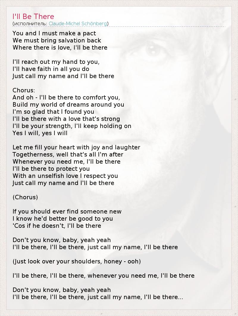 Я буду рядом Ты и я должны заключить договор. Мы должны принести спасение туда, где есть любовь. Я буду рядом. Я протяну тебе свою руку, У меня будет вера во всё, что ты делаешь. Просто, назови мое имя, и я буду рядом. Я буду рядом, чтобы успокоить тебя, Построю свой дом грёз вокруг тебя. Я так рад, что я встретил тебя. Я буду рядом с любовью, что сильна. Я буду твой силой, я буду продолжать держаться. Да, я буду. Я буду. Позволь мне наполнить твоё сердце радостью и смехом, Духовным единением. Ну, вот и всё, что мне нужно. Каждый раз, когда ты будешь нуждаться во мне, я буду рядом. Я буду рядом, чтобы защитить тебя. Бескорыстной любовью я оберегаю тебя. Просто, назови моё имя, и я буду рядом. Если ты когда-нибудь встретишь кого-то другого, Я знаю, ему лучше быть добрым к тебе. Потому что, если он не будет таким, я буду рядом. Разве ты не знаешь? Я буду рядом, я буду рядом. Просто, назови моё имя, я буду рядом. (Просто оглянись) Я буду рядом. Я буду рядом. Я буду рядом. Каждый раз, когда ты будешь нуждаться во мне, я буду рядом. Разве ты не знаешь? Я буду рядом. Я буду рядом. Просто, назови моё имя, я буду рядом. Перевод: Laura © lyrsense.com