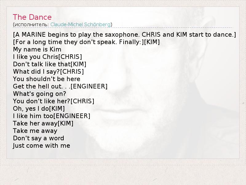 [A MARINE begins to play the saxophone. CHRIS and KIM start to dance.]