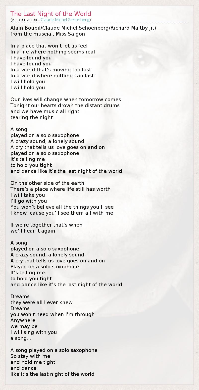 Alain Boubil/Claude Michel Schoenberg/Richard Maltby Jr.) from the muscial. Miss Saigon In a place that won't let us feel In a life where nothing seems real I have found you I have found you In a world that's moving too fast In a world where nothing can last I will hold you I will hold you Our lives will change when tomorrow comes Tonight our hearts drown the distant drums and we have music all right tearing the night A song played on a solo saxophone A crazy sound, a lonely sound A cry that tells us love goes on and on played on a solo saxophone It's telling me to hold you tight and dance like it's the last night of the world On the other side of the earth There's a place where life still has worth I will take you I'll go with you You won't believe all the things you'll see I know 'cause you'll see them all with me If we're together that's when we'll hear it again A song played on a solo saxophone A crazy sound, a lonely sound A cry that tells us love goes on and on Played on a solo saxophone It's telling me to hold you tight and dance like it's the last night of the world Dreams they were all I ever knew Dreams you won't need when I'm through Anywhere we may be I will sing with you a song... A song played on a solo saxophone So stay with me and hold me tight and dance like it's the last night of the world