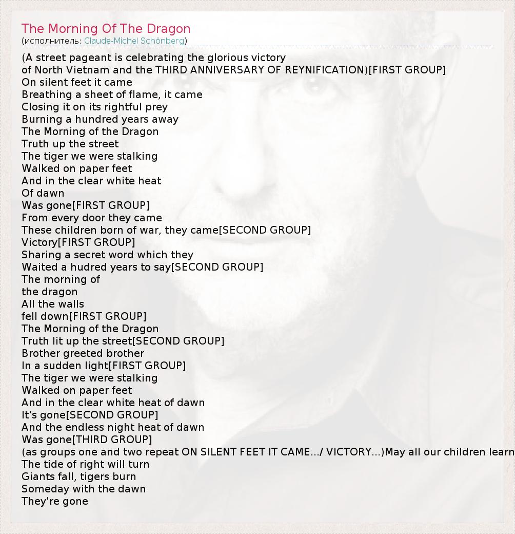 (A street pageant is celebrating the glorious victory of North Vietnam and the THIRD ANNIVERSARY OF REYNIFICATION)[FIRST GROUP] On silent feet it came Breathing a sheet of flame, it came Closing it on its rightful prey Burning a hundred years away The Morning of the Dragon Truth up the street The tiger we were stalking Walked on paper feet And in the clear white heat Of dawn Was gone[FIRST GROUP] From every door they came These children born of war, they came[SECOND GROUP] Victory[FIRST GROUP] Sharing a secret word which they Waited a hudred years to say[SECOND GROUP] The morning of the dragon All the walls fell down[FIRST GROUP] The Morning of the Dragon Truth lit up the street[SECOND GROUP] Brother greeted brother In a sudden light[FIRST GROUP] The tiger we were stalking Walked on paper feet And in the clear white heat of dawn It's gone[SECOND GROUP] And the endless night heat of dawn Was gone[THIRD GROUP] (as groups one and two repeat ON SILENT FEET IT CAME.../ VICTORY...)May all our children learn The tide of right will turn Giants fall, tigers burn Someday with the dawn They're gone