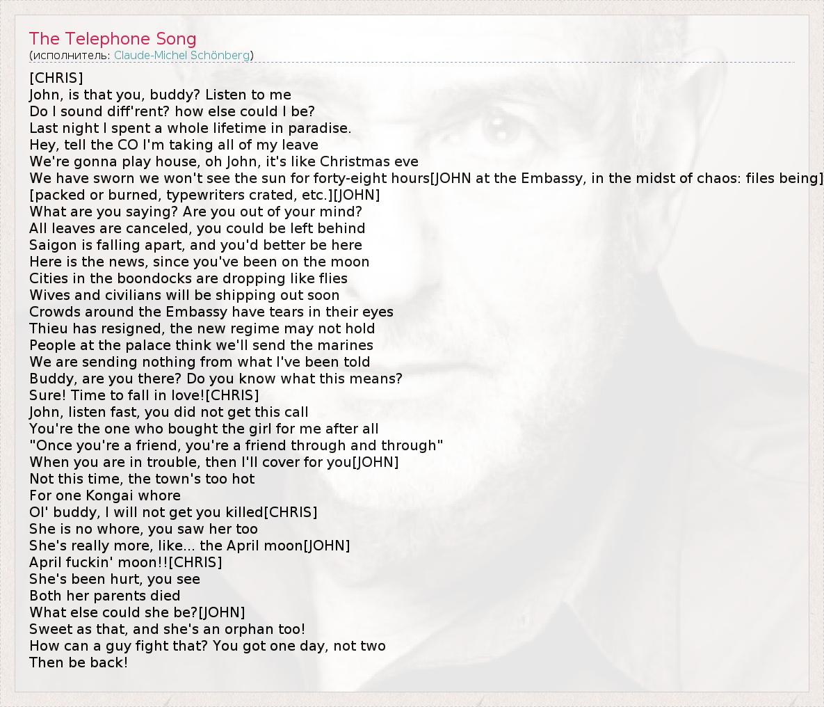 [CHRIS] John, is that you, buddy? Listen to me Do I sound diff'rent? how else could I be? Last night I spent a whole lifetime in paradise. Hey, tell the CO I'm taking all of my leave We're gonna play house, oh John, it's like Christmas eve We have sworn we won't see the sun for forty-eight hours[JOHN at the Embassy, in the midst of chaos: files being] [packed or burned, typewriters crated, etc.][JOHN] What are you saying? Are you out of your mind? All leaves are canceled, you could be left behind Saigon is falling apart, and you'd better be here Here is the news, since you've been on the moon Cities in the boondocks are dropping like flies Wives and civilians will be shipping out soon Crowds around the Embassy have tears in their eyes Thieu has resigned, the new regime may not hold People at the palace think we'll send the marines We are sending nothing from what I've been told Buddy, are you there? Do you know what this means? Sure! Time to fall in love![CHRIS] John, listen fast, you did not get this call You're the one who bought the girl for me after all "Once you're a friend, you're a friend through and through" When you are in trouble, then I'll cover for you[JOHN] Not this time, the town's too hot For one Kongai whore Ol' buddy, I will not get you killed[CHRIS] She is no whore, you saw her too She's really more, like... the April moon[JOHN] April fuckin' moon!![CHRIS] She's been hurt, you see Both her parents died What else could she be?[JOHN] Sweet as that, and she's an orphan too! How can a guy fight that? You got one day, not two Then be back!