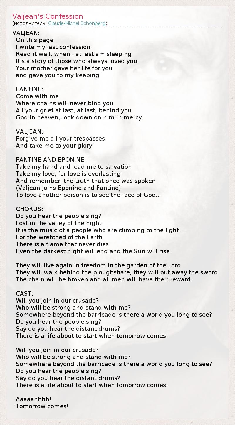 VALJEAN: On this page I write my last confession Read it well, when I at last am sleeping It's a story of those who always loved you Your mother gave her life for you and gave you to my keeping FANTINE: Come with me Where chains will never bind you All your grief at last, at last, behind you God in heaven, look down on him in mercy VALJEAN: Forgive me all your trespasses And take me to your glory FANTINE AND EPONINE: Take my hand and lead me to salvation Take my love, for love is everlasting And remember, the truth that once was spoken (Valjean joins Eponine and Fantine) To love another person is to see the face of God... CHORUS: Do you hear the people sing? Lost in the valley of the night It is the music of a people who are climbing to the light For the wretched of the Earth There is a flame that never dies Even the darkest night will end and the Sun will rise They will live again in freedom in the garden of the Lord They will walk behind the ploughshare, they will put away the sword The chain will be broken and all men will have their reward! CAST: Will you join in our crusade? Who will be strong and stand with me? Somewhere beyond the barricade is there a world you long to see? Do you hear the people sing? Say do you hear the distant drums? There is a life about to start when tomorrow comes! Will you join in our crusade? Who will be strong and stand with me? Somewhere beyond the barricade is there a world you long to see? Do you hear the people sing? Say do you hear the distant drums? There is a life about to start when tomorrow comes! Aaaaahhhh! Tomorrow comes!