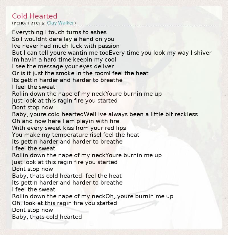 Everything I touch turns to ashes So I wouldnt dare lay a hand on you Ive never had much luck with passion But I can tell youre wantin me tooEvery time you look my way I shiver Im havin a hard time keepin my cool I see the message your eyes deliver Or is it just the smoke in the roomI feel the heat Its gettin harder and harder to breathe I feel the sweat Rollin down the nape of my neckYoure burnin me up Just look at this ragin fire you started Dont stop now Baby, youre cold heartedWell Ive always been a little bit reckless Oh and now here I am playin with fire With every sweet kiss from your red lips You make my temperature riseI feel the heat Its gettin harder and harder to breathe I feel the sweat Rollin down the nape of my neckYoure burnin me up Just look at this ragin fire you started Dont stop now Baby, thats cold heartedI feel the heat Its gettin harder and harder to breathe I feel the sweat Rollin down the nape of my neckOh, youre burnin me up Oh, look at this ragin fire you started Dont stop now Baby, thats cold hearted