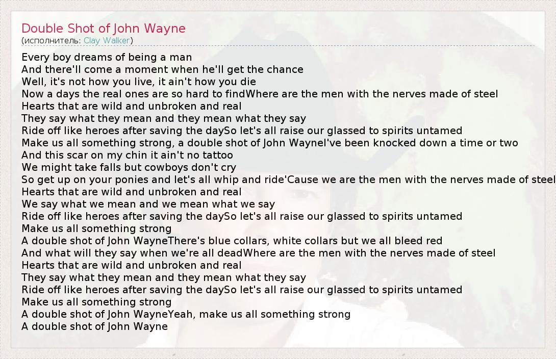 Every boy dreams of being a man And there'll come a moment when he'll get the chance Well, it's not how you live, it ain't how you die Now a days the real ones are so hard to findWhere are the men with the nerves made of steel Hearts that are wild and unbroken and real They say what they mean and they mean what they say Ride off like heroes after saving the daySo let's all raise our glassed to spirits untamed Make us all something strong, a double shot of John WayneI've been knocked down a time or two And this scar on my chin it ain't no tattoo We might take falls but cowboys don't cry So get up on your ponies and let's all whip and ride'Cause we are the men with the nerves made of steel Hearts that are wild and unbroken and real We say what we mean and we mean what we say Ride off like heroes after saving the daySo let's all raise our glassed to spirits untamed Make us all something strong A double shot of John WayneThere's blue collars, white collars but we all bleed red And what will they say when we're all deadWhere are the men with the nerves made of steel Hearts that are wild and unbroken and real They say what they mean and they mean what they say Ride off like heroes after saving the daySo let's all raise our glassed to spirits untamed Make us all something strong A double shot of John WayneYeah, make us all something strong A double shot of John Wayne