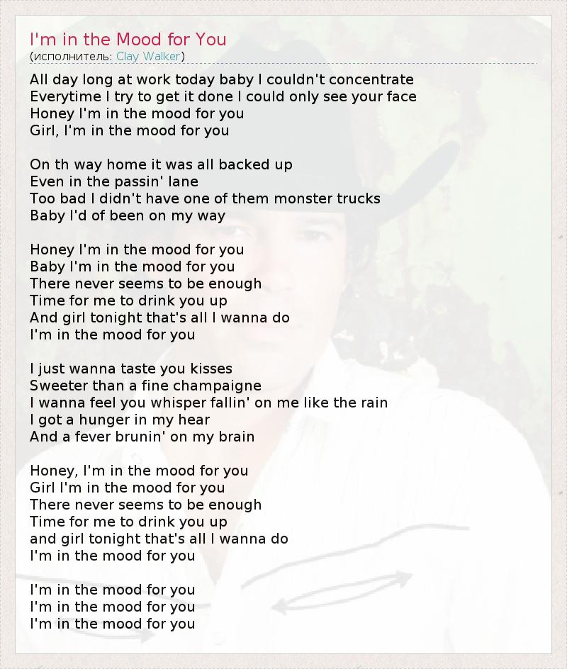 All day long at work today baby I couldn't concentrate Everytime I try to get it done I could only see your face Honey I'm in the mood for you Girl, I'm in the mood for you On th way home it was all backed up Even in the passin' lane Too bad I didn't have one of them monster trucks Baby I'd of been on my way Honey I'm in the mood for you Baby I'm in the mood for you There never seems to be enough Time for me to drink you up And girl tonight that's all I wanna do I'm in the mood for you I just wanna taste you kisses Sweeter than a fine champaigne I wanna feel you whisper fallin' on me like the rain I got a hunger in my hear And a fever brunin' on my brain Honey, I'm in the mood for you Girl I'm in the mood for you There never seems to be enough Time for me to drink you up and girl tonight that's all I wanna do I'm in the mood for you I'm in the mood for you I'm in the mood for you I'm in the mood for you