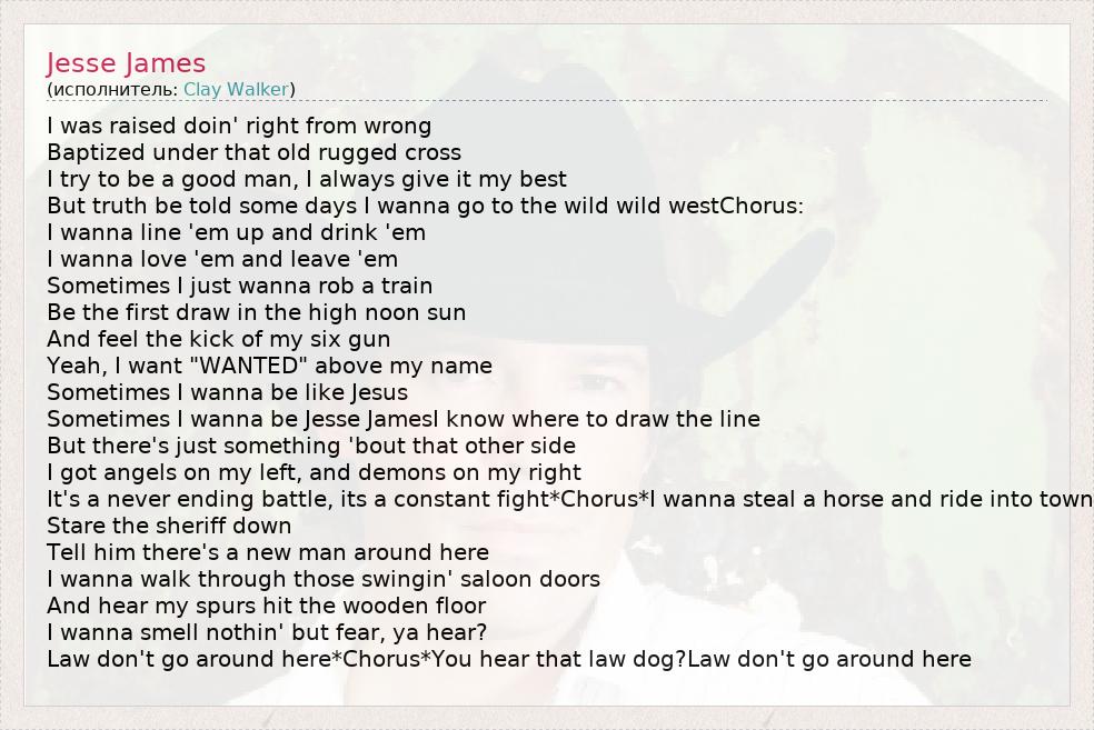 I was raised doin' right from wrong Baptized under that old rugged cross I try to be a good man, I always give it my best But truth be told some days I wanna go to the wild wild westChorus: I wanna line 'em up and drink 'em I wanna love 'em and leave 'em Sometimes I just wanna rob a train Be the first draw in the high noon sun And feel the kick of my six gun Yeah, I want "WANTED" above my name Sometimes I wanna be like Jesus Sometimes I wanna be Jesse JamesI know where to draw the line But there's just something 'bout that other side I got angels on my left, and demons on my right It's a never ending battle, its a constant fight*Chorus*I wanna steal a horse and ride into town Stare the sheriff down Tell him there's a new man around here I wanna walk through those swingin' saloon doors And hear my spurs hit the wooden floor I wanna smell nothin' but fear, ya hear? Law don't go around here*Chorus*You hear that law dog?Law don't go around here