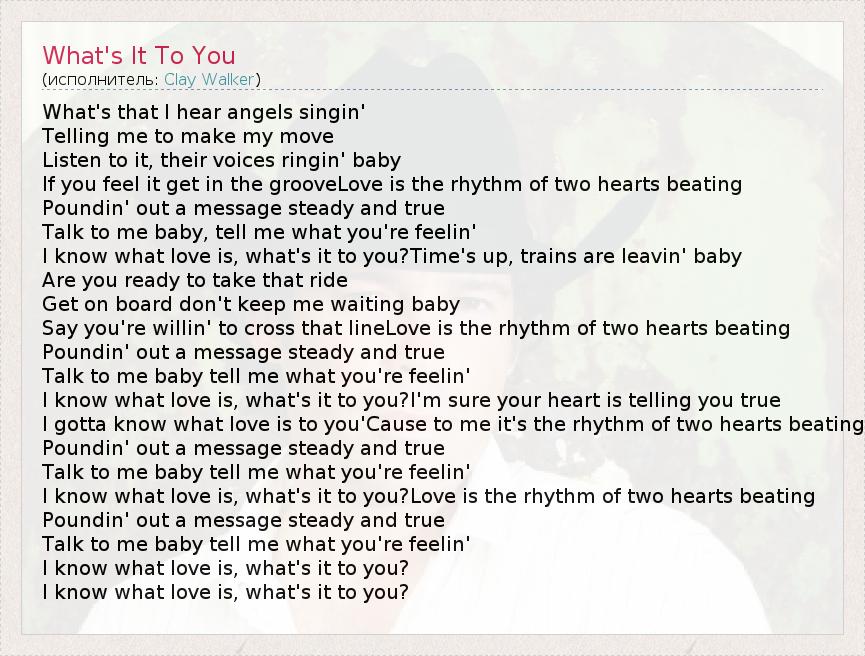 I know what love is, what's it to you?Love is the rhythm of two hearts beating