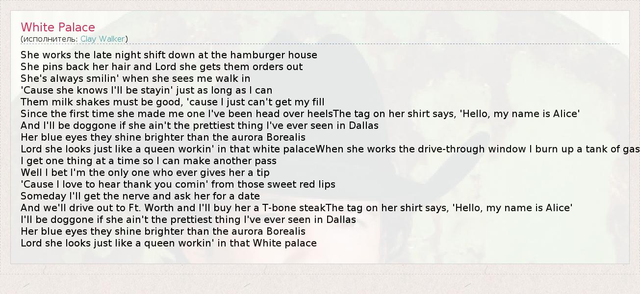 Lord she looks just like a queen workin' in that white palaceWhen she works the drive-through window I burn up a tank of gas