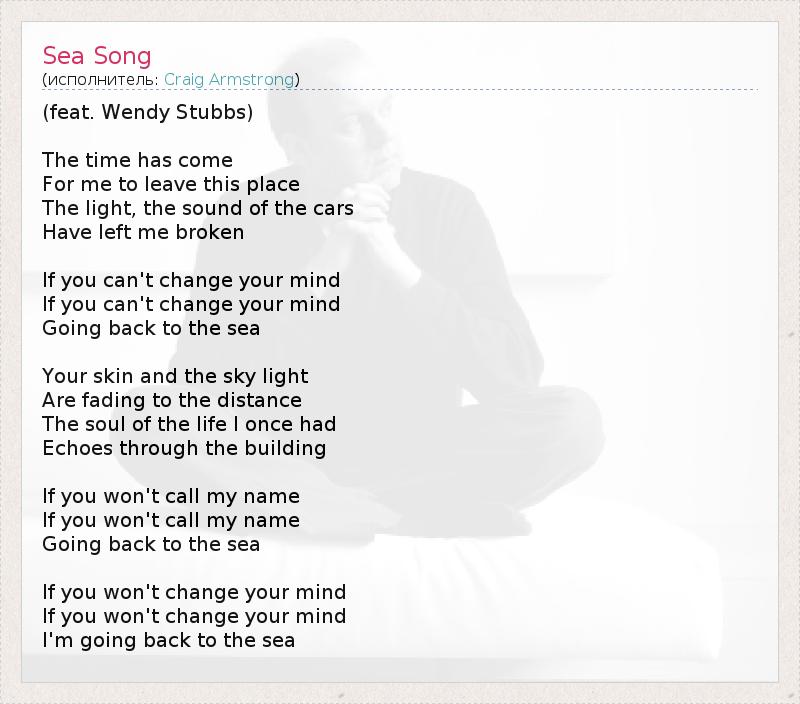 (feat. Wendy Stubbs) The time has come For me to leave this place The light, the sound of the cars Have left me broken If you can't change your mind If you can't change your mind Going back to the sea Your skin and the sky light Are fading to the distance The soul of the life I once had Echoes through the building If you won't call my name If you won't call my name Going back to the sea If you won't change your mind If you won't change your mind I'm going back to the sea