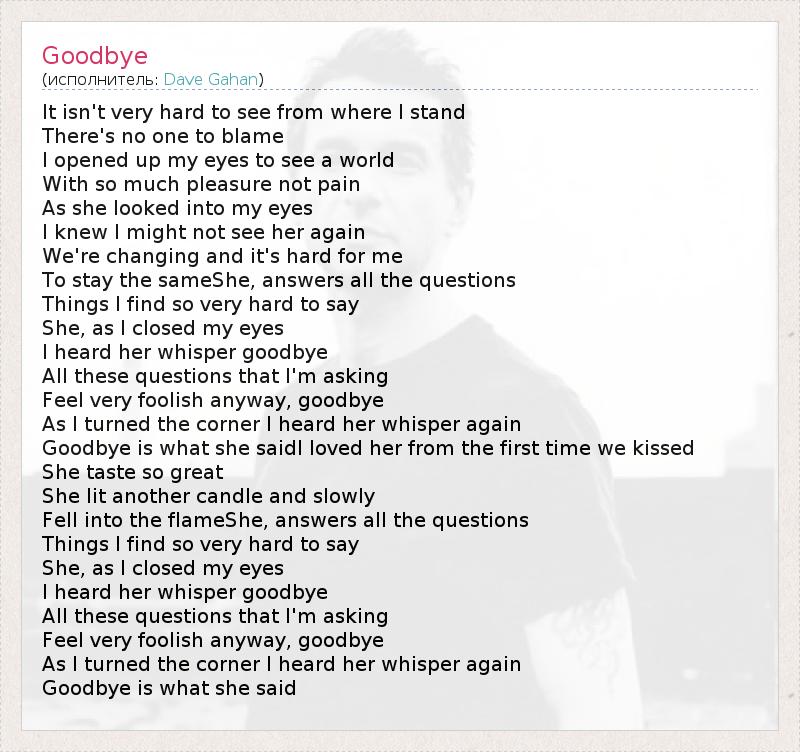 It isn't very hard to see from where I stand There's no one to blame I opened up my eyes to see a world With so much pleasure not pain As she looked into my eyes I knew I might not see her again We're changing and it's hard for me To stay the sameShe, answers all the questions Things I find so very hard to say She, as I closed my eyes I heard her whisper goodbye All these questions that I'm asking Feel very foolish anyway, goodbye As I turned the corner I heard her whisper again Goodbye is what she saidI loved her from the first time we kissed She taste so great She lit another candle and slowly Fell into the flameShe, answers all the questions Things I find so very hard to say She, as I closed my eyes I heard her whisper goodbye All these questions that I'm asking Feel very foolish anyway, goodbye As I turned the corner I heard her whisper again Goodbye is what she said